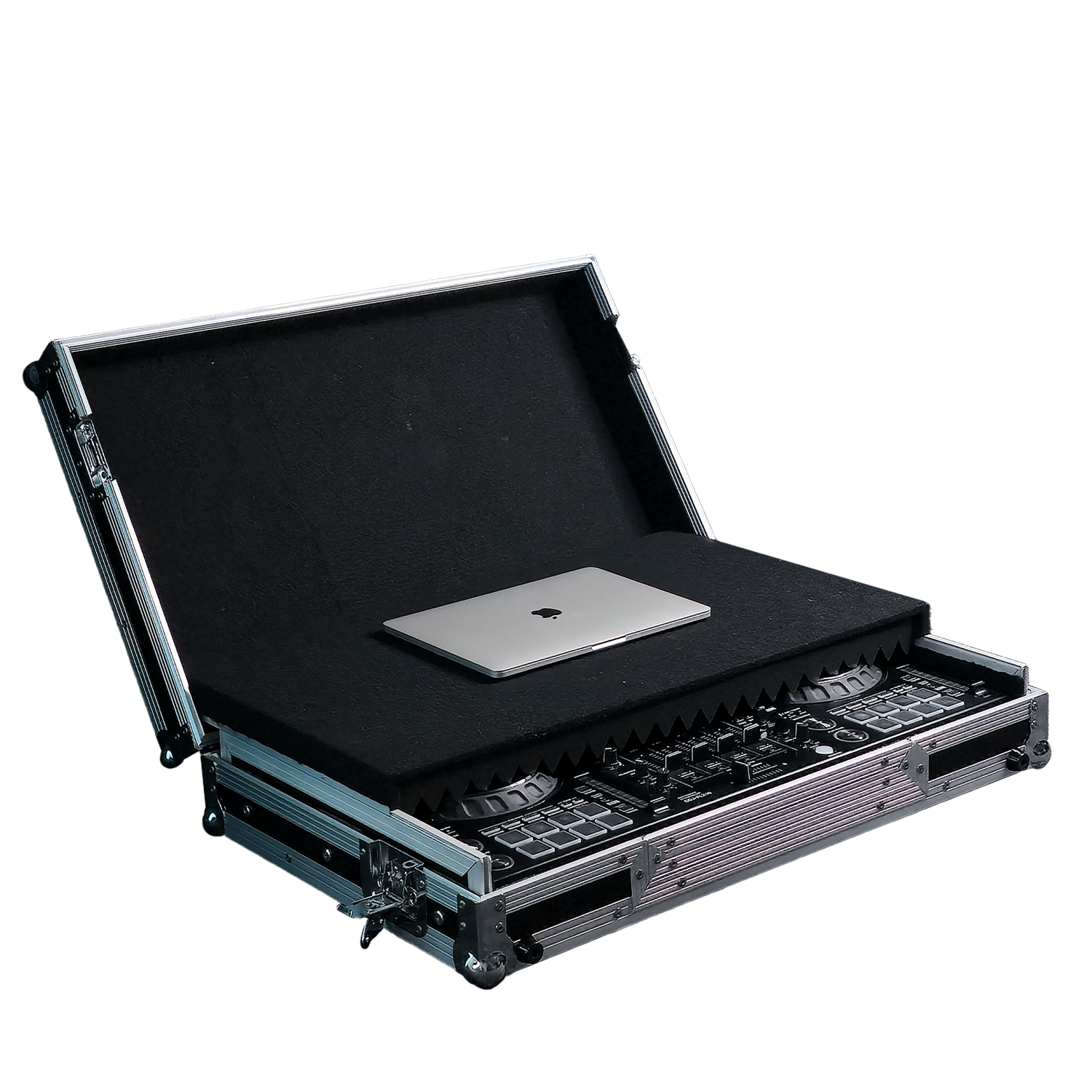 Elementul distinctiv al acestui model este polița interioară glisantă pentru laptop, care asigură o poziție perfectă și ergonomică în timpul mixajului. Aceasta permite un setup compact și profesionist, fără suporturi externe suplimentare și fără cabluri încurcate. Totul este pregătit pentru show imediat după deschiderea capacului.